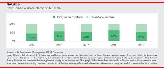Chris(2017)在研究Coinbase(美国最大的数字货币交易所,也是全球最大的美元和数字货币交易平台)2012-2016年的用户类型后,提出超过一半的用户,买入比特币持有时间超过一年,也就是投资用户(即买下并持有比特币超过一年的用户)。而少于一半的用户,在一年内就卖掉手里的比特币,所以属于交易用户(transactional medium)。但是,Chris对交易用户的定义未免过于武断,如果是高频交易,短期投机交易,用户都不会持有比特币超过很长的时间,根据Chris的定义,他们都被错误地归类为交易用户,然而他们并不是把比特币当成交易的中介,而是投机或者投资的媒介。