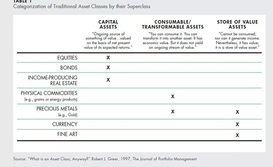 关于数字货币归类的问题,众说纷纭。1997年,Robert J提出超级类别(Super Class)的概念,也就是根据传统资产类别的特点,在这个分类基础上归类为资本类资产(Captial Assets)(包含股权,债券,房地产)、消费类/可变类资产(包括商品和某些贵金属),还有价值储藏类(比如某些贵金属、货币和艺术品)。根据这种超级类别的分法,数字货币同时具有其中三种类别的属性,把数字货币划分为任何一个类别都是不完整的和片面的。