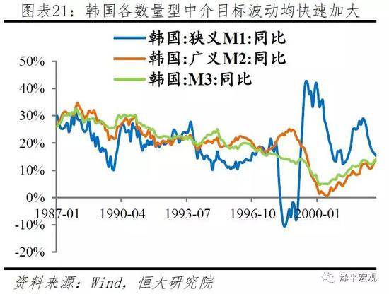 韩国在建国初期至20世纪90年代期间,由于数量型中介目标稳定性下降,不断扩大中介目标范围,从一开始的M1,逐步扩大至M2、MCT(包含M2、大额存单和货币市场基金)、以及M3。随着利率市场化不断推进,1997年韩国逐步取消所有存款利率管制,货币政策目标过渡至隔夜回购利率,1999年正式将货币政策调控框架由数量型转变为价格型。
