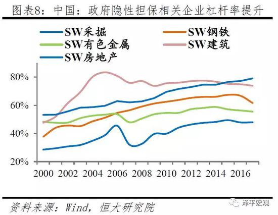我国国企和地方政府融资平台具有预算软约束背书,即使借款主体陷入财务困境仍可获得外部资源救助,而房地产行业具有房价背书,“房价永远会涨”的信仰使得房地产企业具有持续的借贷意愿。以我国上市公司资产负债率为例,2000年以来,我国房地产企业资产负债率由53%上升至79%,过剩产能行业及国企集中的行业杠杆率平均上升20个百分点,金融资源大量积聚。