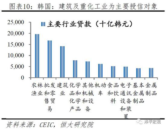 韩国在60-80年代的高速追赶期,同样存在着经济结构性问题,大量政府隐性担保的存在导致企业盲目扩张,存在投资饥渴症,缺乏自律性,过度的政策保护和扶持导致了低效率和高负债,1998年末建筑及其他重化工业产品成为韩国商业银行授信占比靠前的行业。此外,由于企业做的越大越能得到政府各种支持,导致大企业与中小企业差距越拉越大,财阀资产负债率高企,大量财阀资产负债率位于300-500%区间(任泽平,2010)。