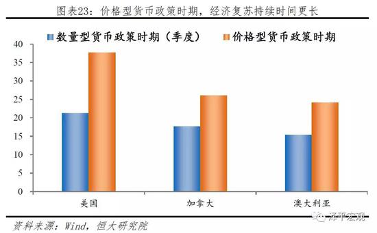 我们将美国、加拿大、澳大利亚三个国家的货币政策分为数量型时期及价格型时期,以GDP当季同比增速为主要指标,分别计算期间内每一次经济衰退后复苏持续的时间。在不考虑经济结构、基本面以及经济自身弹性的情况下,我们发现对单个国家而言,当货币政策框架从数量型转为价格型后,经济衰退后复苏的时间均显著长于数量型货币政策时期。