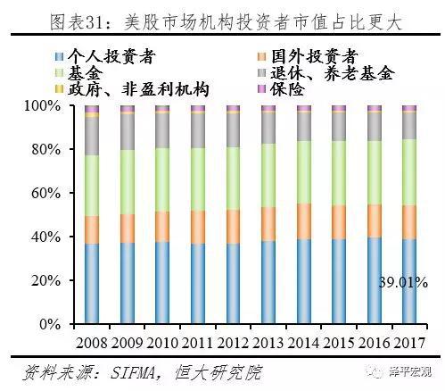 4)投资者结构方面,港股以机构投资者为主,投资方式相对理性。港股2016年机构投资者交易额占比为53%,且超过半数为欧美机构,个人投资者占比仅24%,其余23%为香港交易所参与者,主要为券商做市及自营,因此香港投资者结构更加成熟。