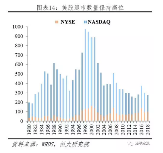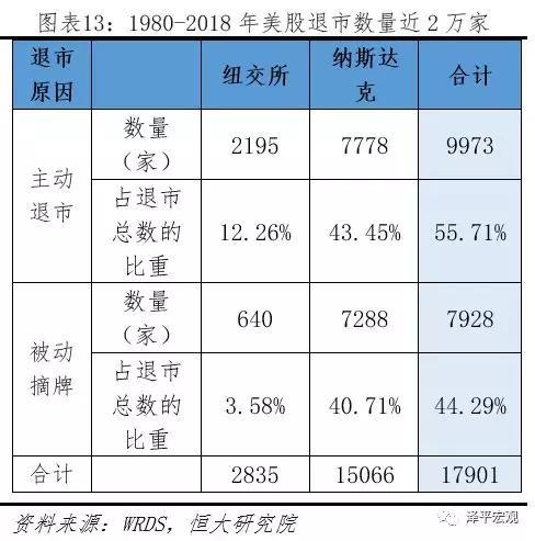 2)退市规则清晰,退市率高。美股退市规则涉及自愿退市和强制退市,强制退市情形包括交易类指标、持续经营能力指标和合规性指标,退市红线与上市标准对应,重视量化指标,参考定性指标,一定程度上缩小了交易所的自由裁量权,但可操作性强。美股公司退市规模庞大,退市率高。WRDS的数据显示,从1980年到2018年,美股共有17901家企业退市,年均退市率为19%,纽交所退市2835家,纳斯达克退市15066家。