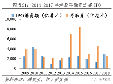 2)再融资政策宽松,容易被大股东和庄家滥用为圈钱工具。香港再融资条件宽松,一是时间限定少,IPO之后6个月既可再融资;二是程序简便,不需要监管机构审批,只需通过公司内部程序;三是闪电配售,即大股东将自己的旧股票配售给特定机构,然后公司增发新股票来补足大股东的控股占比。2014-2017年再融资金额是IPO筹资额的2.8倍。极为宽松的再融资条件沦为壳公司的圈钱工具。一些主业不振的公司大股东采用供股方式,不断对老股东大比例低价供股例如威利国际进行过五次供股,供股比例最大达到一供八,折价达83%,如果小股东不认购则股权被稀释。