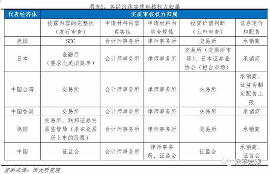 无论哪种发行制度均强调信息披露,实质审核责任由监管、自律和市场承担。对比发达经济体资本市场,注册制不是仅进行发行资料的备案或“形式审核”,而是将实质性审核的主体多元化,政府监管机构、交易所、会所、律所、券商等事实上都承担了部分实质审核的任务。美日注册制中,监管机构奉行“披露原则”,真实全面披露即可发行,交易所设立多元化硬性上市标准,投资价值的判断则交由市场机构。财务信息审核交给专业的会所,律所负责申请材料的合规性,券商对投资价值进行判断;中国香港、德国的混合注册制,交易所往往掌握上市主导权,不仅设立硬性上市标准,还设置主观标准,如发展前景、是否具有融资需求进行实质审核。
