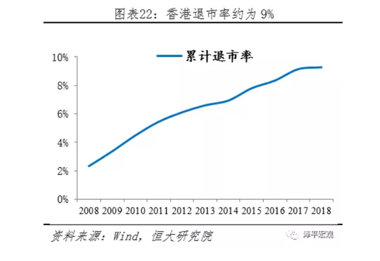 6)港股退市不畅通。2008-2018年累计退市214家公司,累计退市率9%,年均退市率1.2%,相比于美国年均19%退市率仍然较低,主要原因在于:一是退市标准宽松。交易所认为发行人不再适合上市、缺乏足够业务或财务运作条件,资不抵债等情况下,可以将该证券除牌,但缺少定量标准,主观性较大。二是退市程序冗长。香港主板退市分为三阶段,每个阶段至少六个月,中间可以通过重组或卖壳复牌。三是投资者保护不足。香港没有设场外市场,退市股票无法流通,对投资者利益影响重大,监管部门投鼠忌器。