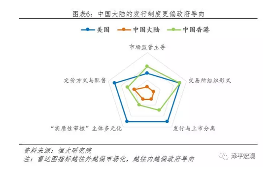 决定一个经济体的资本市场导向是偏市场化的“注册制”还是偏政策导向的“核准制”有三个因素:1)审核程序:核准制重心在监管,注册制重心在市场;2)审核内容:对“实质性审核”的监管分权;3)配套制度:定价和配售方式、退市制度、交易制度、再融资制度等。具体而言,资本市场由自律监管为主导则更偏市场化,由政府主导则更偏政策导向;证券交易所的组织方式是公司制则更偏市场化,会员制则相对偏政策导向;监管机构是否进行“实质性审核”不能作为判断市场导向的基础,但“实质性审核”主体仅为政府机构则表明更偏政策导向,审核主体多元化则表明更偏市场导向;采取累计投标询价配合自主配售的发行定价机制更偏市场化,但实践中多以混合模式为主,各种定价方式扬长避短。