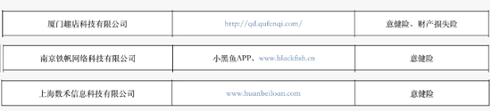 以开展此类合作较多的易安保险为例,其在官网披露的‘合作第三方网络平台清单’中,趣店的名字赫然在列,另外分众传媒旗下‘还呗’(上海数禾信息科技有限公司)、蓝领贷APP、小黑鱼等也在其中,合作的产品无一例外都是‘意健险’。