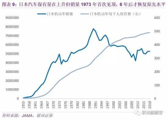 汽车低保有量和销售负增长,并不矛盾。日本和韩国的每千人机动车保有量还在上升,但销量分别在1973年和1996年首次见顶,经过6年和4年才恢复到原先水平。