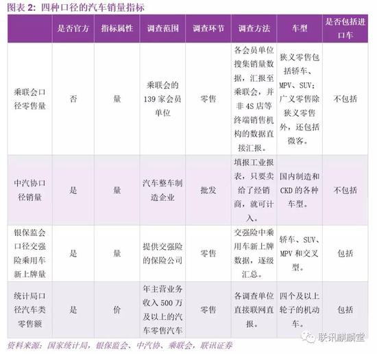 将上述四个口径的汽车销量指标作对比,如下表所示。