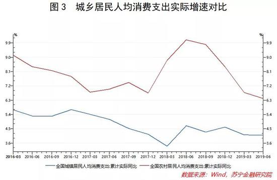 我们不妨对城乡居民的收入和支出状况做一番考察。根据国家统计局有关数据,近几年的农村居民人均可支配收入实际同比增速一直显著高于城镇居民,相应地,农村居民人均消费支出实际同比增速也高于城镇居民(参见图2、图3)。
