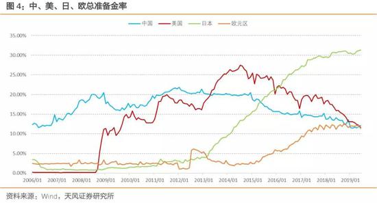 注意到,基础货币/M2正是货币乘数的倒数。因而,总准备金率实际上也反映了经济体的货币乘数。当然,各国准备金政策差异较大(例如美国将库存现金计入准备金),广义货币统计口径也各有不同(中美使用M2,欧元区是M3,日本则为M3+CDs。因而,实际数据口径会有差异,但基本含义是相似的。