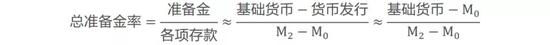 总准备金率实际还反映货币乘数。以中国为例,缴纳法定存款准备金率的存款基本都包括在M2的范围之内(非银存款也在缴准范围,准备金率为0),总准备金率可以换算成下式: