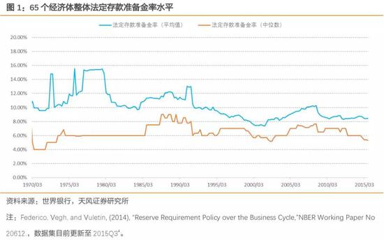 作为一项重要的货币政策工具,法定存款准备金的作用在不断弱化。20世纪80年代以来,随着货币政策由数量调控转向利率为主的价格调控,平均法定存款准备金率整体明显下行。目前发达国家法定存款准备金率已降至很低的水平,美日欧整体均在3%以下,加拿大、澳大利亚甚至完全取消法定存款准备金率。截至2015年三季度,65个经济体的法定存款准备金率平均值和中位数为8.47%、5.33%。