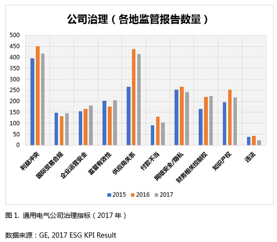 通用电气公司治理的信息披露面对两个主要问题:一是只列示监管报告数据,缺少与公司治理有效性的直接关联。参考通用电气ESG绩效成果报告可知,企业核心公司治理绩效指标集中以各地监管报告数量的形式呈现。通用电气表示下属全球共计620名检察员可以独立出具风险监管报告,成为早期发现潜在合规性问题的第一道防线。数据显示,2017年监管报告数量呈现下降趋势且整体可控,但这只代表监管员对风险的判断与预警,无法代表企业实际公司治理效能。二是缺少指标详细定性分析。根据图1可知,利益冲突、供应商关系、网络安全、知识产权是监管报告数量层面的关注风险点。但除了量化数据之外,相关领域具体情形没有任何总结性描述。以供应商为例,供应商合作关系有待改善与供应商舞弊、关联方交易绝非同日而语,这些信息更无法单纯从一组数据反映出来。