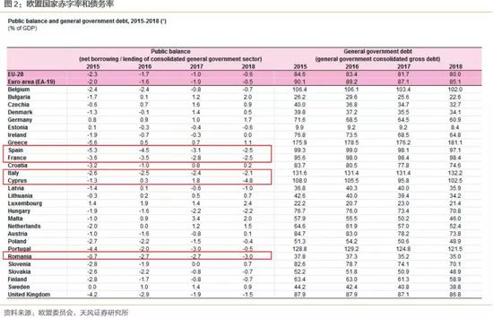 2018年欧盟28国的平均赤字率是0.6%。赤字率超过2%的国家包括西班牙(2.5%),法国(2.5%),意大利(2.1%),塞浦路斯(4.8%),罗马尼亚(3%)。