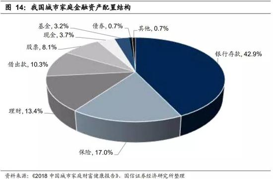 从资金端来看,我国金融产品匮乏,投资品种单一。由于大量企业及居民配置于存款及理财产品,相应期限较短,缺乏可以长投的资金,资金供给与实体经济融资需求难以合理匹配。2018年末,我国城市家庭银行存款占比高42.9%,理财产品占比13.4%,股票、债券、基金等风险资产占比仅为 12%。此外,由于我国财富管理服务质量、专业性欠缺,投资者教育水平有限,居民整体缺乏对金融产品的了解,且风险承受能力较弱,无法有效动员社会富余资金投入到新兴产业中去。