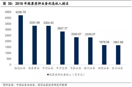 大型龙头券商在股票质押业务中占据优势。从2018年股票质押业务收入来看,排名前三的分别是海通证券(42.29亿元)、国泰君安(33.31亿元)、中信证券(33.24亿元)。