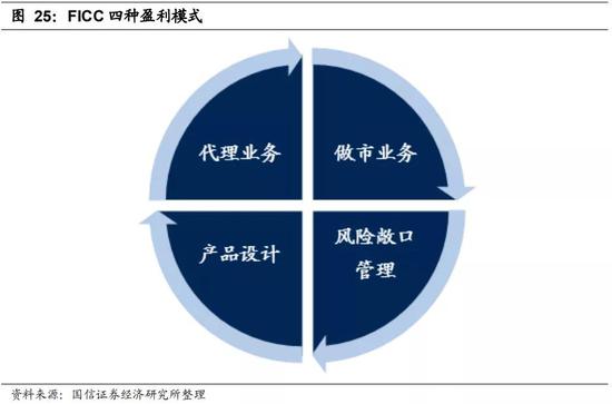 FICC包括四种盈利模式。(1)代理业务,券商利用牌照优势代理客户交易,获得佣金收入。(2)做市服务,券商作为客户对手方提供报价,最终赚取买卖价差。(3)产品设计,券商根据客户需求设计产品,获得相应的财务顾问收入以及产品执行过程中的利息收入等。(4)风险敞口管理,券商提供FICC服务往往带来风险敞口,对其管理过程中会带来投资收益、利息收入或汇兑损益等收入项目。