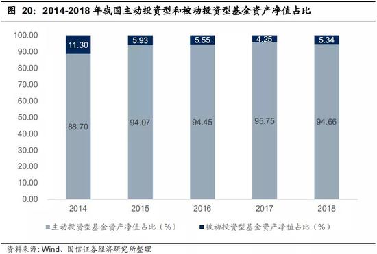 庞大的机构投资者群体将促进被动型投资产品快速扩张。近年来,我国被动投资型基金的资产净值在全部基金中占比一直较小,这是因为我国A股个人投资者占比较高,而个人投资者频繁交易的特性更倾向于选择主动投资产品。和主动投资相比,被投资数基金具有透明化、低成本、风险分散的特性,能在削减交易成本和费用的条件下获取长期稳健收益,因此机构投资者所持有的长期资金往往倾向于选择被动投资型产品。未来客户的机构化趋势将促进被动型投资产品需求大幅上涨。