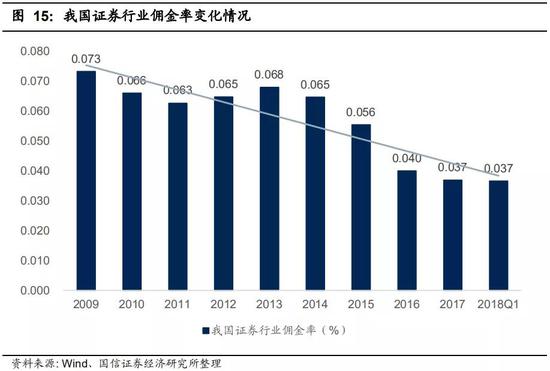 外资持股券商比例逐步放宽。我国券商逐步放宽外资投资比例可大致分为四个阶段:外资持股比例分别为1/3、49%、51%、无限制。外资持股比例的放宽和优质境外资本的进入将推动国内证券公司转变经营理念、规范业务发展,将加剧证券行业的竞争,优化整个行业格局。由于国内券商佣金率持续下滑,在国际竞争加剧的格局下,具有较强资本实力和国际业务竞争力的大型龙头券商将持续显现优势。