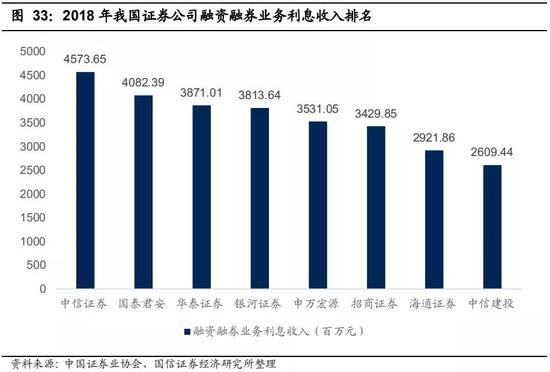 大型龙头券商在融资融券业务中占据优势。从2018年融资融券业务收入来看,排名前三的分别是中信证券(45.73亿元)、国泰君安(40.82亿元)和华泰证券(38.71亿元)。