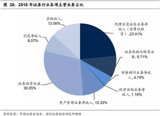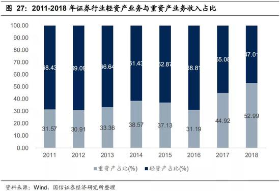 证券行业重资产业务占比持续上升。2011-2018年我国证券行业的传统通道业务(代理买卖证券业务)收入贡献持续下滑,从2011年50.67%下降至2018年23.41%;与此同时,以融资融券、股票质押、股权投资为核心的重资产业务收入贡献稳步上升,2012-2018年,重资产业务对营业收入的贡献度从31.57%提升52.99%,而依托牌照的轻资产业务(经纪、投行)收入占比继续下降。