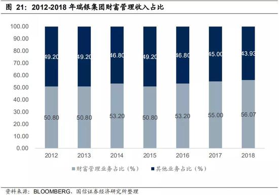 瑞银集团(UBS)是全球最大的财富管理机构。瑞银集团财富管理模式的核心在于对客户需求的理解能力和自上而下的资产配置能力,公司提供投资管理、财富规划、银行信贷以及企业财务咨询等服务,其财富管理业务模块有清晰的业务流程:(1)评估客户风险承受能力;(2)跟踪分析各类资产的风险收益;(3)确定投资策略;(4)设计投资组合;(5)动态跟踪调整。近年来,财富管理业务每年为瑞银贡献的收入都超过50%,业务范围遍布全球市场。