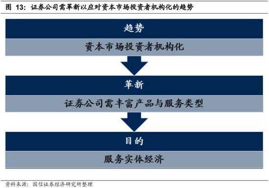 在资本市场机构化发展趋势下,证券公司作为连接资本市场和实体经济的桥梁,需要进行产品与服务的变革创新。近年来,证券行业产品与服务同质化程度较高、金融创新力度仍显不足。同时,实体企业的金融需求正变得越来越多样化、复杂化,这就亟需证券公司不断提升综合服务能力。资本市场的机构化发展意味着对证券公司产品的丰富多样性和服务的综合专业性提出更高要求,证券公司需要不断地进行业务创新和服务优化的变革迭代,以满足机构投资者的需求。