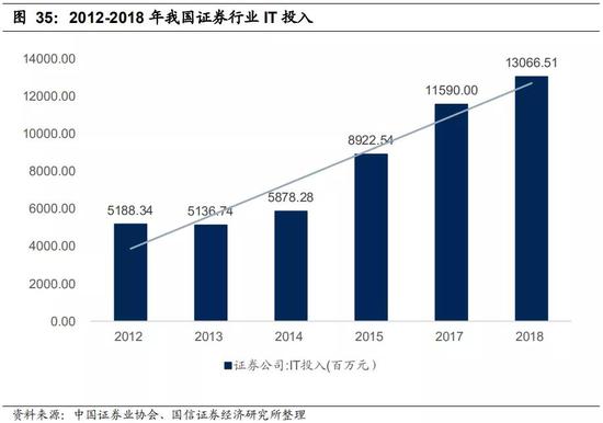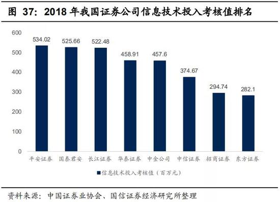 从我国证券行业的金融科技投入来看,2012年-2018年信息技术投入逐年上升,由2012年51.88亿元增长到2018年130.66亿元。截止到2018年末,我国证券公司信息系统投入金额排名前三的公司分别为国泰君安(7.04亿元)、长江证券(2.97亿元)和中信证券(5.80亿元);信息技术投入考核值排名前三的公司分别为平安证券(5.34亿元)、国泰君安(5.26亿元)和长江证券(5.22亿元)。