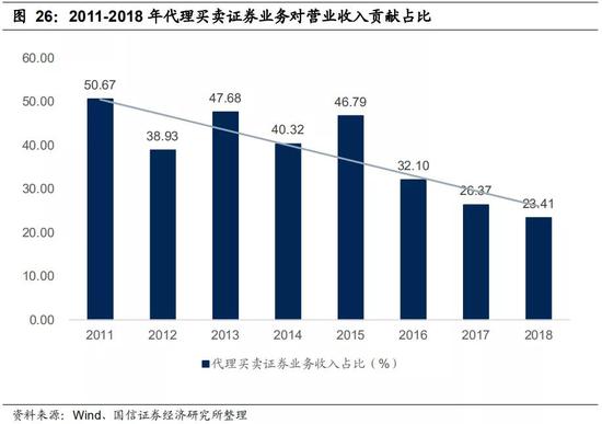 (3)经营模式同质化。雷同且单一的业务结构造就了整个证券行业的经营模式。在我国证券行业发展之初,因券商牌照的存在,券商经营主要依靠经纪业务,并以四大传统业务牌照为基准来开展通道业务。这种盈利模式不考虑市场细分和客户需求,只是追求绝对规模扩张(比如营业网点迅速增加)。