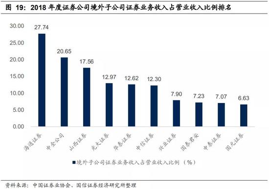 投行业务国际化已取得阶段性成果,大型龙头券商处于领先优势。国内券商的投行业务逐步进行国际化拓展,以满足中资企业境外投融资需求。美、日投行国际化发展的路径来总体分为三步:优势业务开拓新区域、做强当地业务、业务全球化。国内证券公司国际化的路径通常为:立足香港、布局亚太、辐射全球。目前大批行业领先的龙头券商已经在中国香港市场成立了网点。从2018年证券公司境外子公司证券业务收入占营业收入比例排名来看,海通证券(27.74%)、中金公司(20.65%)、山西证券(17.56%)排名居前。