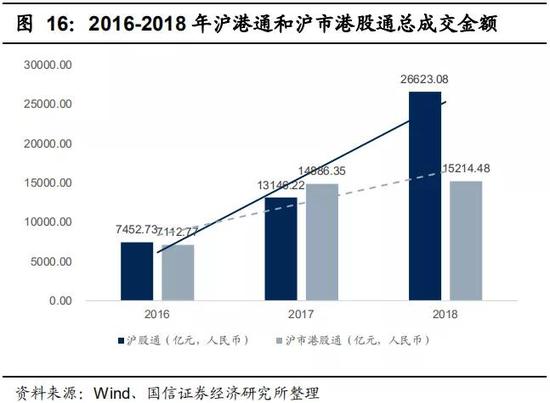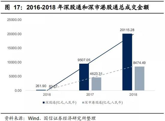 随着资本市场开放逐步深化,MSCI增加A股权重,沪港通、深港通运行良好,有利于证券行业的国际业务开展。近年来总成交额持续扩张,2016年沪股通和沪市港股通总成交金额分别为7452.73 亿元、7112.77 亿元,2018年已增长至26623..08亿元、15214.48亿元;2016年深股通和深市港股通总成交金额仅为261.90 亿元、83.57 亿元,2018年分别增长为20115.28亿元、8474.49亿元。