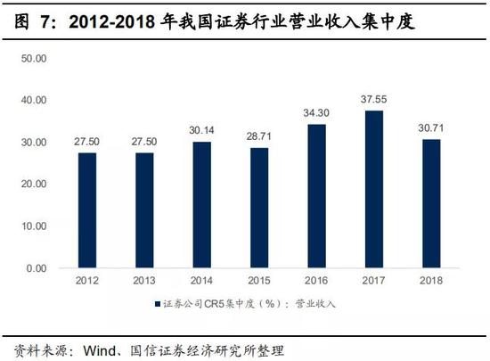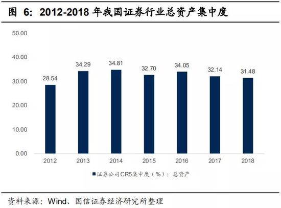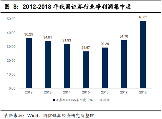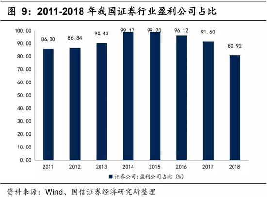 大型券商凭借规模优势、平台优势、品牌优势,龙头优势逐渐扩大,市场集中度加速提升。2018年,我国总资产、营业收入、净利润排名前5位的证券公司占全行业的31.48%、30.71%、48.62%。但与此同时,2018年以来,经济下行压力增大,资本市场持续低迷,2018年我国证券行业盈利公司占比为80.92%,同比下降11.7%;营业收入同比下降14.47%,净利润同比下降41.04%。