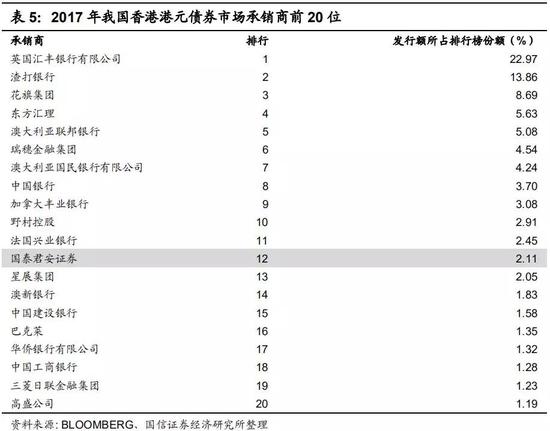 从债券发行业务来看,2017年中国香港港元债券承销商前40位中,国际一流投行依然占主要地位,内地证券公司国泰君安证券、海通证券分别排名第12位、第32位,市场份额占比分别为2.11%、0.30%。