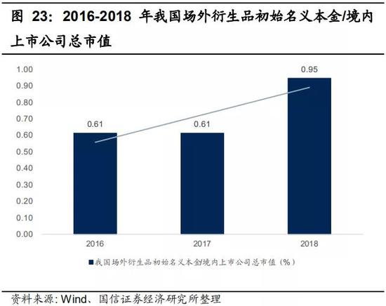 从交易规模来看,我国衍生品业务发展迅猛,但和发达国家仍有差距。一方面我国场外衍生品规模近年来迅速扩大,2018年我国场外衍生品交易新增名义本金规模为8772.06亿元,同比增长17. 13%;另一方面,近年来我国衍生品名义本金/境内上市公司市值比重均值不足1%,而美国则达到10%。