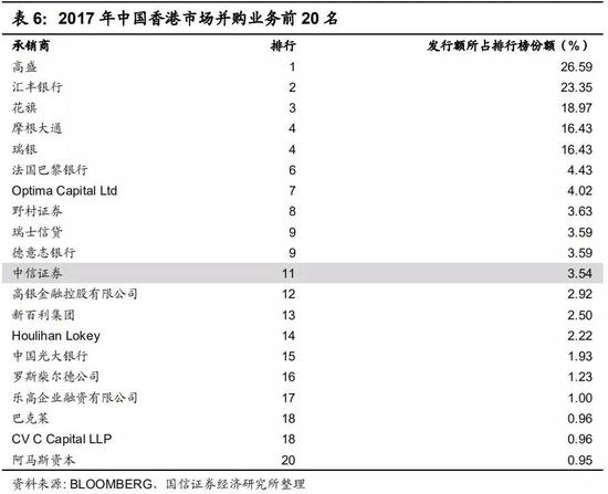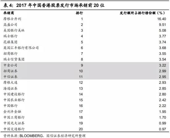 从中国香港股票承销市场来看,2017年发行额前50位中也仅有14家中国内地证券公司,合计市场份额占比18.28%,发行金额为61.73亿美元。