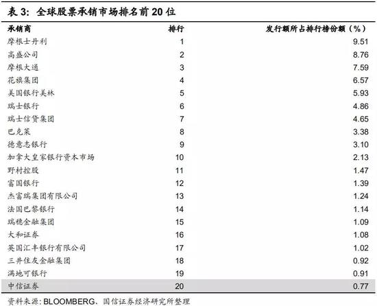 从全球股票承销市场来看,2017年前50名中只有9家国内证券公司,合计市场份额仅占4.17%,发行额为240.35亿美元。全球股票发行市场承销商前20位中,仅有中信证券一家中资证券公司。
