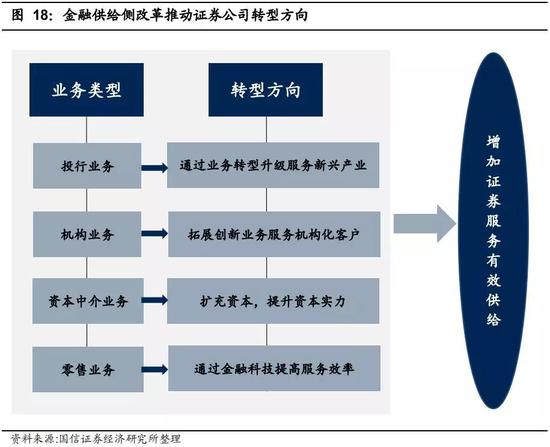 自从我国经济进入“新常态”以来,金融总量供给充足,但结构性问题凸显,目前我国金融体系服务新兴产业的能力不足,限制了金融助推实体经济转型的能力。金融供给侧结构性改革的目的是服务实体经济,增加有效供给,提升金融资源配置效率。证券公司作为连接资本市场和实体经济的桥梁,近年来面临着内在隐患与外在困境,导致其对直接融资的有效供给严重不足。为了更高质量、高效率地服务于实体经济,金融供给侧改革将推动证券公司投行业务、机构业务、资本中介业务、零售业务全面转型。