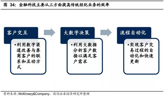 金融科技将渗入传统零售业务,从而提高服务效率。金融科将推动证券公司的数字化转型,有效提升客户体验的满意度和证券经营机构的内部运营管理水平,加快实现智能化运营与数字化运营。传统零售业务将通过金融科技实现改造升级。具体来看,金融科技在证券公司的应用可以表现为:客户交互提升、大数据推动决策、运营流程自动化和布局创新。