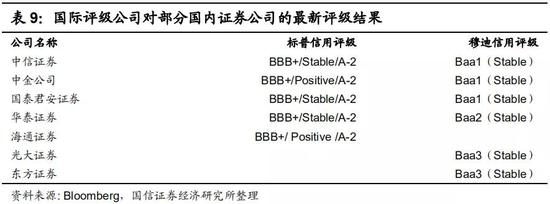 大型龙头券商在国际评级中占据优势地位。国际评级有助于券商拓展境外融资渠道,降低融资成本,提高国际资本市场影响力,并为国际布局提供有力支持。近年来,国内部分券商持续获得来自国际著名评级公司穆迪、标准普尔的评级。从评级结果来看,穆迪授予国内券商的主体信用评级集中在Baa1至Baa3,标普集中在BBB和BBB+。从评级结果来看,龙头券商依然占据优势地位。