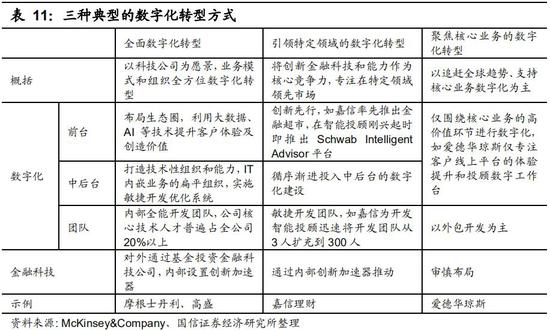 数字化转型主要分为三种方式:全面数字化转型、引领特定领域的数字化转型和聚焦核心业务的数字化转型。代表券商分别摩根士丹利、高盛、嘉信理财、爱德华琼斯等。