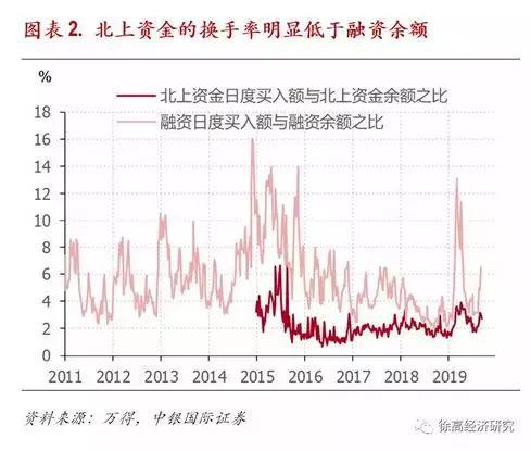 北上资金的换手率明显低于融资余额。由北上资金日度买入额与北上资金余额之比,可以间接推知北上资金的换手率高低。类似地,也可以计算融资买入额与融资余额之比,来间接观察融资的换手率。二者相比,北上资金换手率明显低于融资余额。(图表 2)