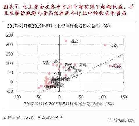北上资金在绝大多数行业都取得了超额收益,并且在餐饮旅游与食品饮料两个行业中的收益最为突出。在从2017年1月到2019年8月这差不多3年时间里,北上资金在中信29个一级行业中的28个都取得了超越行业指数累积涨幅的累积持股收益率,仅在通信行业微幅跑输行业指数。在餐饮旅游与食品饮料两个行业中个,北上资金取得了最高的累积收益率,累积收益率接近200%。(图表 7)