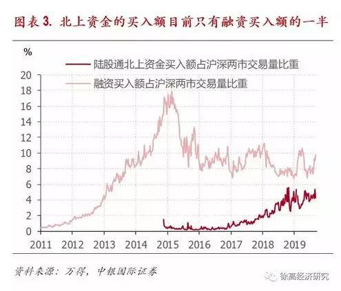 北上资金在A股买入额中的占比大概只有融资占比的一半。由于换手率明显低于融资,所以尽管北上资金的存量规模已经与融资余额相当,但北上资金在A股整个市场的买入额中占比只有约5%,大约只有融资余额占比的一半。(图表 3)