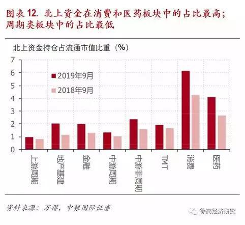 北上资金最偏好消费和医药股,对上游周期股兴趣偏低。北上资金对不同行业股票的偏好度有明显差异。我们将A股中信29个一级行业加总成了八大行业,分别为上游周期(包含煤炭、有色、钢铁),地产基建(地产、建筑、建材),金融(银行、非银),中游周期(石化、化工、机械、汽车),中游非周期(公共事业、电力设备、军工、交运),TMT(电子、通信、计算机、传媒),消费(轻工、商贸、餐饮、家电、纺织服装、食品饮料、农业)以及医药。在这八大行业中,北上资金在消费和医药中的占比明显高于其他六大行业。而在上游周期行业中,北上资金的占比最低。(图表 12)