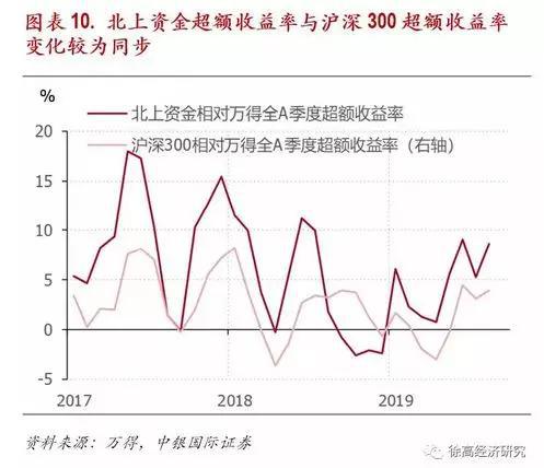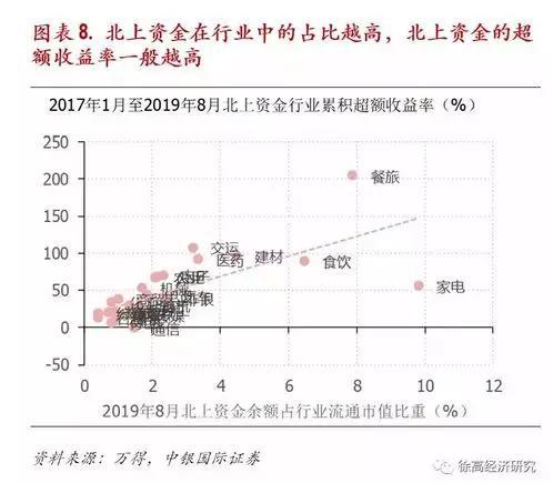 一般而言,在北上资金占较高的行业中,北上资金所取得的超额收益率较高。通过北上资金在行业中的资金余额与行业流通市值的比例,可以看出北上资金在不同行业中的占比情况。2019年8月末,北上资金在家电行业中的占比最高,接近10%。北上资金在餐饮旅游与食品饮料两个行业中的占比也较高。可以发现,北上资金占比越高的行业,北上资金所取得的超额收益率也倾向于越高(家电是个明显的例外)。二者之间的相关性究竟是什么原因造成的还需研究,但从中至少能得出这么一个结论:在北上资金占比越高的行业中,北上资金的动向越值得关注。(图表 8)