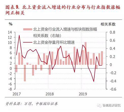 北上资金流入的行业分布与行业指数涨幅之间正相关。北上资金除了在各个行业中普遍取得了超额收益,其流入的行业分布对行业筛选也有参考意义。在最近两年中,北上资金行业的流入增速与行业指数涨幅之间有虽然不很强,但较为稳定的正相关关系。将北上资金流入的行业分布纳入考虑,应该可以提升投资时行业筛选的准确度。(图表 9)