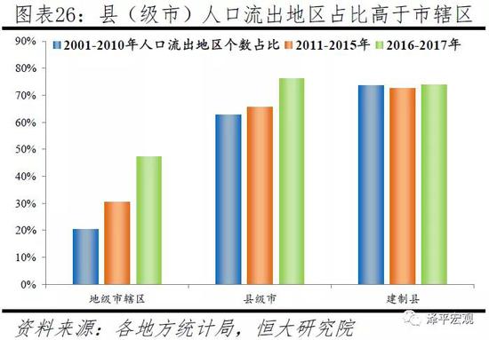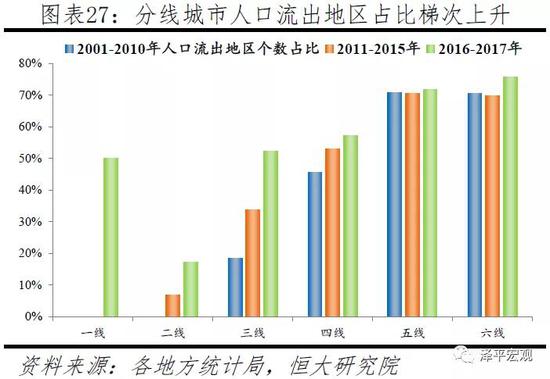 分线看,一线城市中京沪由于控人近年人口流出,二线城市人口流出地区个数占比从0增至17.2%,三线城市从18.3%增至52.1%,四线城市从45.5%增至57.3%,五线城市从70.6%增至71.6%,六线城市从70.4%增至75.7%。一线城市前些年一直保持强劲的人口流入态势,但北京、上海因严控人口近年常住人口已开始流出。二三四线城市2001-2010年、2011-2015年、2016-2017年人口流出地区占比均逐渐上升,二线城市三个时间段人口流出地区个数分别为0、2、5个(剔除城市也可能人口流出,低估),占全部二线城市个数的比例从0增至17.2%;三线城市三个时间段人口流出地区个数分别为13、24、37个,占比从18.3%上升到52.1%;四线城市三个时间段人口流出地区个数分别为116、135、146个,占比从45.5%增至57.3%。五六线城市人口流出地区个数占比总体上也有微增趋势,其中五线城市从70.6%增至71.6%,六线城市从70.4%增至75.7%。可以看出,三线城市人口流出地区个数占比增幅最为显著,达33.8个百分点,远高于二线的17.2、四线的11.8、五线的1.0、六线的5.4个百分点。